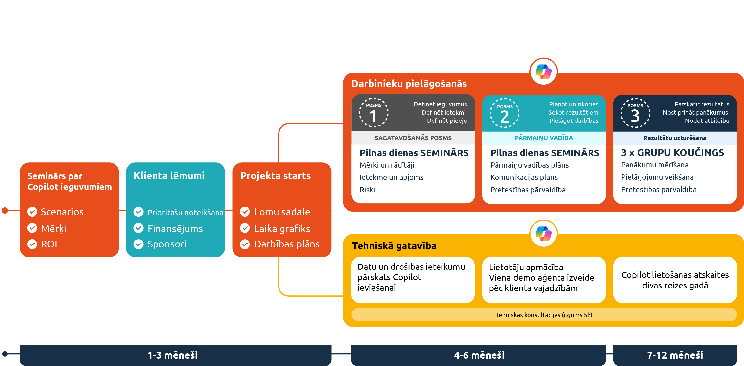 Piedāvājums Copilot ieviešanai ir visaptveroša viena gada programma, kas palīdz uzņēmumiem droši uzsākt mākslīgā intelekta izmantošanu, ar skaidru un strukturētu pieeju. Šis fiksētas maksas risinājums apvieno visu nepieciešamo veiksmīgai Microsoft 365 Copilot ieviešanai – no licencēm un tehniskās sagatavošanas līdz lietotāju apmācībām un drošības pārbaudēm.